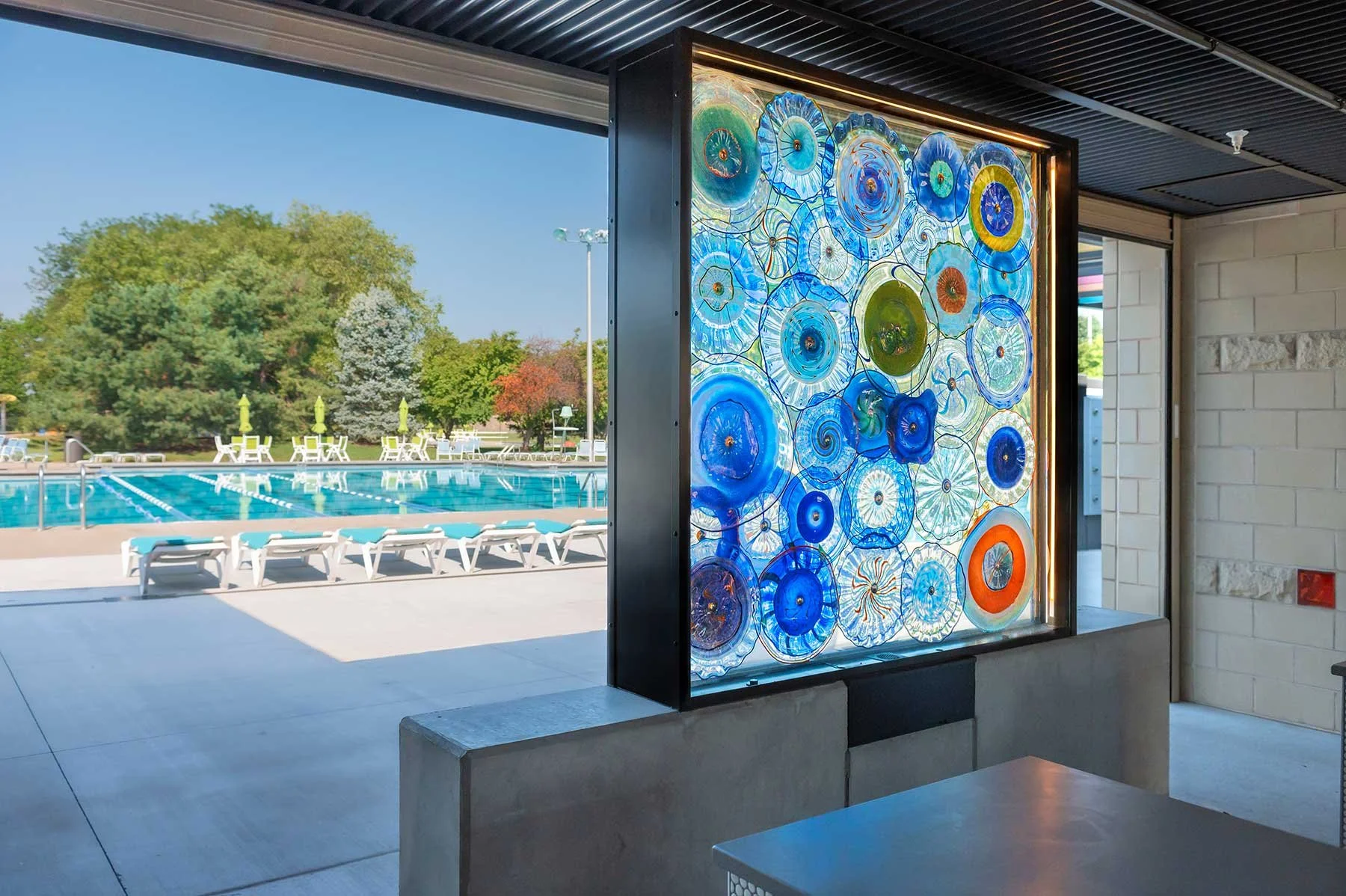 Colorful fused window panels highlight the front entrance of the community aquatic center, known as “The Wave.”