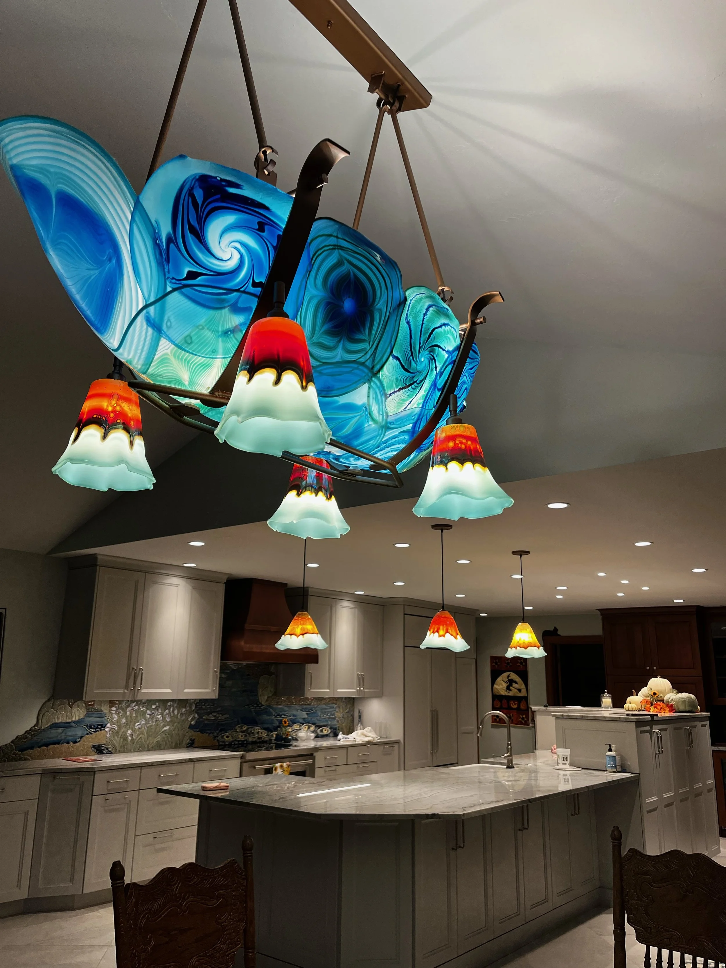 Our art glass installations are often commissioned in residences, featuring glassworks like custom blown glass canopies, signature glass rondel chandeliers, and colorful table lamps.